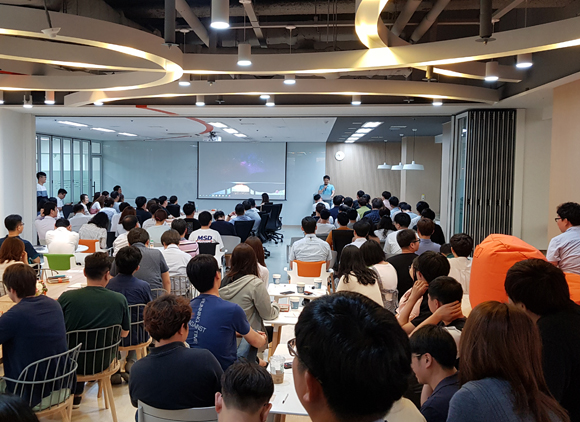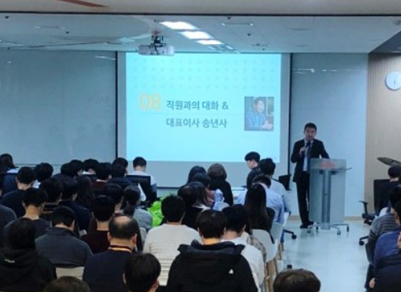 We hold a town hall meeting every half a year. In the meeting, the CEO shares the business performance with employees and hosts Q&A session (anonymous questions).