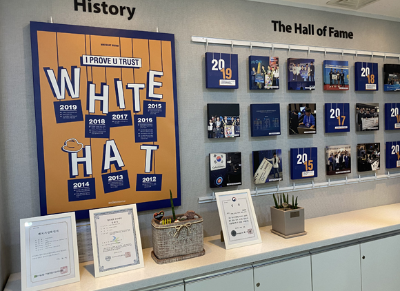 The history of RaonWhiteHat and the pictures of glorious moments of winning hacking competitions are displayed on the wall.